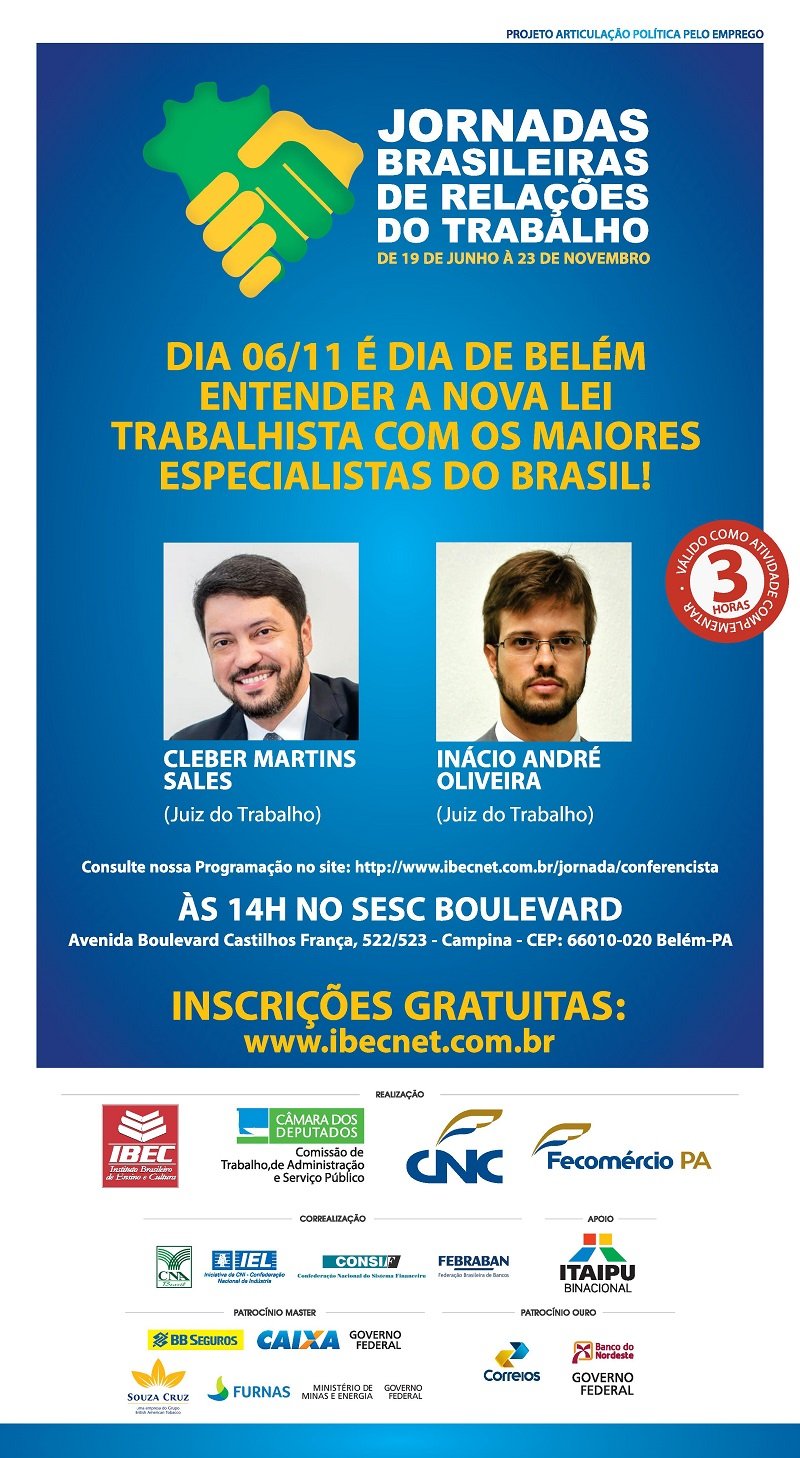 A Fecomércio PA, em parceria com a Confederação Nacional do Comércio de Bens, Serviços e Turismo (CNC), a Comissão de Trabalho de Administração do Serviço Público da Câmara dos Deputados e o Instituo Brasileiro de Ensino e Cultura, promovem na próxima terça-feira (06) no Centro Cultural Sesc Boulevard, o projeto Jornadas Brasileiras de Relações de Trabalho. O objetivo é apresentar à sociedade e aos operadores de direito os principais aspectos da nova legislação trabalhista.