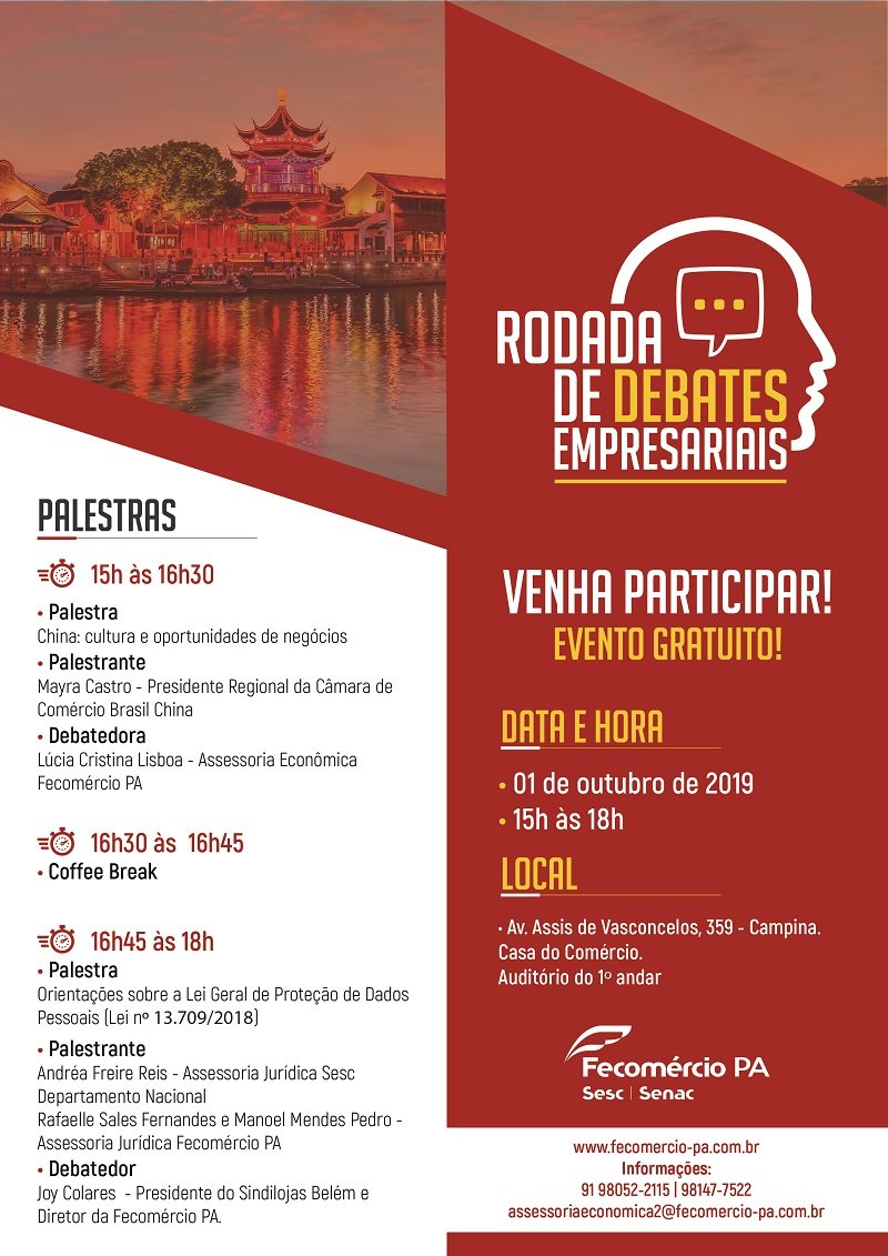 A Federação do Comércio de Bens, Serviços e Turismo do Estado do Pará (Fecomércio PA) promove na tarde desta terça-feira (01), na Casa do Comércio, o evento Rodada de Debates Empresariais. Com entrada gratuita, o evento contará com as palestras "China: cultura e oportunidades de negócios" e "Orientações sobre a Lei Geral de Proteção de Dados Pessoais (Lei Nº 13.709/2018). O evento é uma oportunidade de conhecer os processos que envolvem o mercado exterior, além de oportunizar a troca de experiências, networking e experiências sobre o seu segmento.