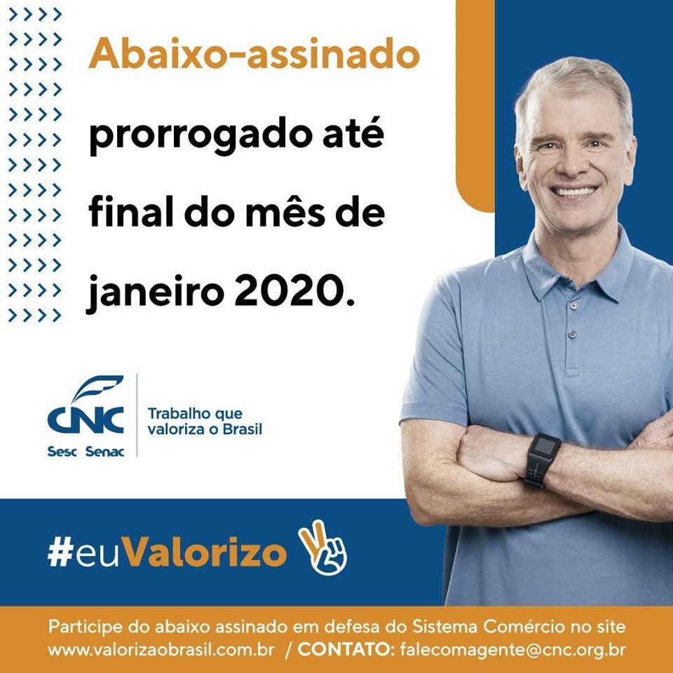 A campanha nacional "Trabalho que Valoriza o Brasil", que tem como objetivo mostrar a importância das entidades que compõem o Sistema Comércio (CNC, Fecomércio, Sindicatos, Sesc e Senac) e a relevância do trabalho das mesmas para o desenvolvimento do Brasil, foi prorrogada até o final do mês de janeiro. O Sistema Fecomércio Pará, Sesc e Senac segue empenhado na coleta de assinaturas, que podem ser assinadas no seguinte endereço: https://bit.ly/35wtFXo
