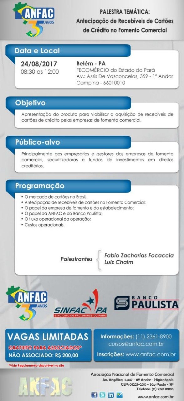 A Associação Nacional de Fomento Comercial (Anfac) promove amanhã (24) na Casa do Comércio, em Belém, a palestra temática “Antecipação de Recebíveis de Cartões de Crédito no Fomento Comercial”. O evento conta com o apoio do Sindicato de Factorings do Pará (Sinfac-PA), Banco Paulista e da Federação do Comércio de Bens, Serviços e Turismo do Estado do Pará (Fecomércio-PA).