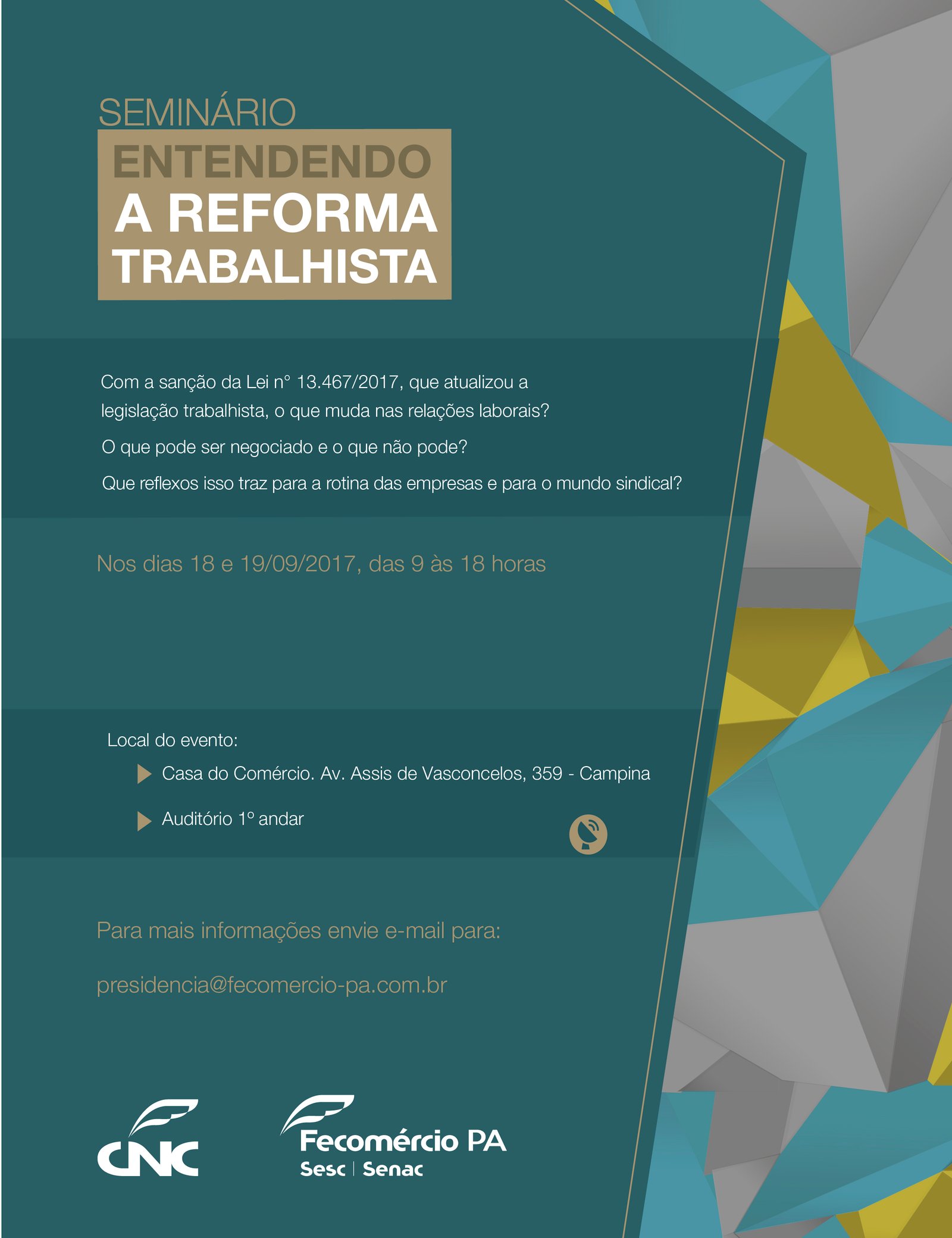 Para esclarecer os impactos e mudanças provocadas pela aprovação da Reforma Trabalhista, a Confederação Nacional do Comércio de Bens, Serviços e Turismo (CNC) promove nos dias 18 e 19 de setembro, no Rio de Janeiro, o seminário “Entendendo a Reforma Trabalhista”, uma oportunidade para debater as recentes alterações na Consolidação das Leis Trabalhistas (CLT) e seus reflexos nas relações trabalhistas. O seminário é voltado para sindicatos filiados, dirigentes do Serviço Nacional do Comércio (Sesc), dirigentes do Serviço Nacional de Aprendizagem do Comerciário (Senac), empresários, negociadores, profissionais de recursos humanos e advogados.
