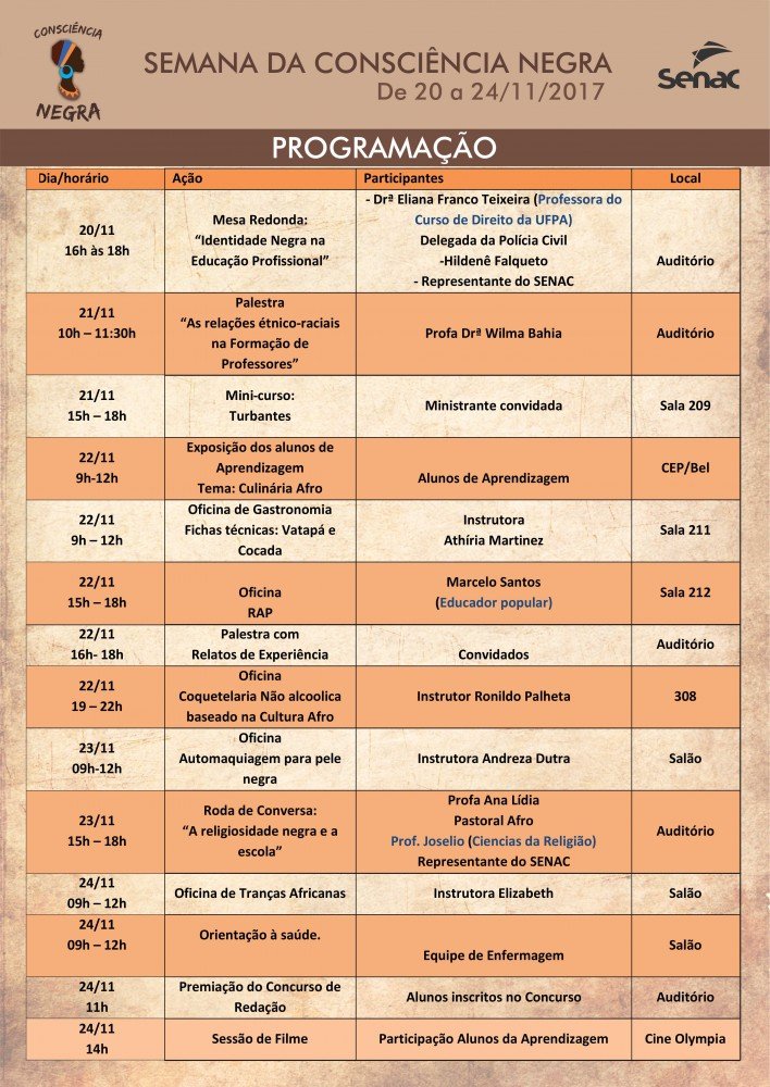 A programação dentro do Senac acontecerá de 20 a 24 de novembro e destacará através de palestras e mesas de debate a presença da cultura negra dentro da Educação como um todo, sobretudo no contexto da Educação Profissional.