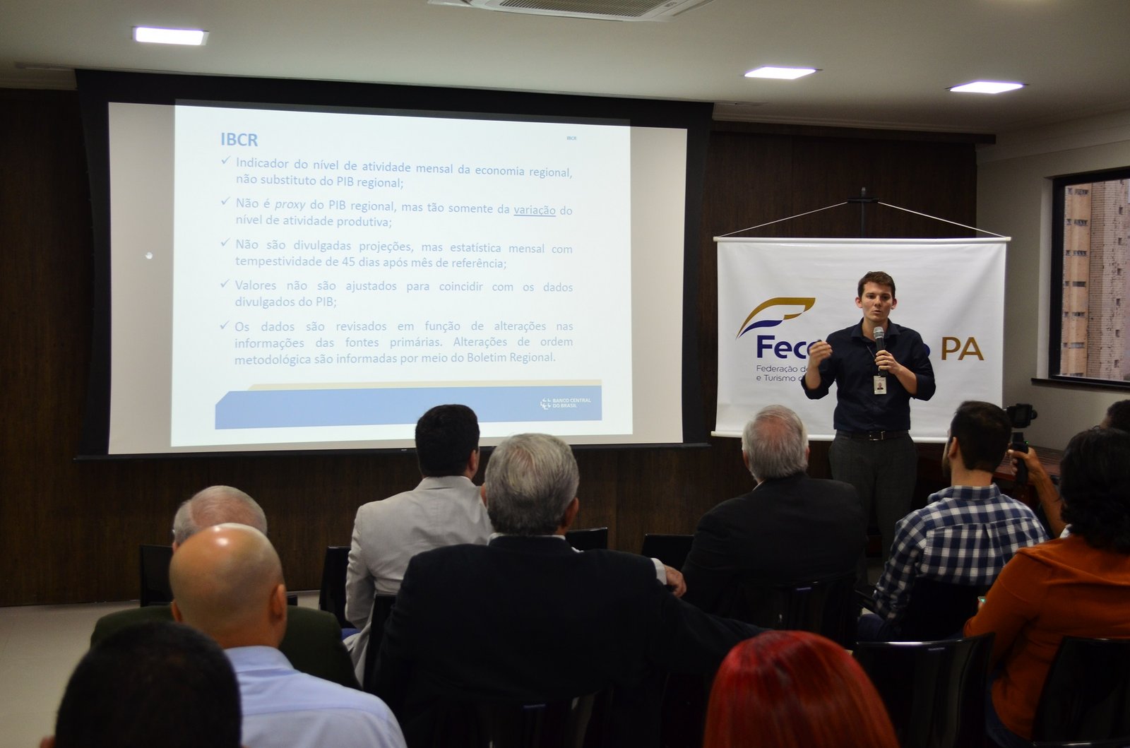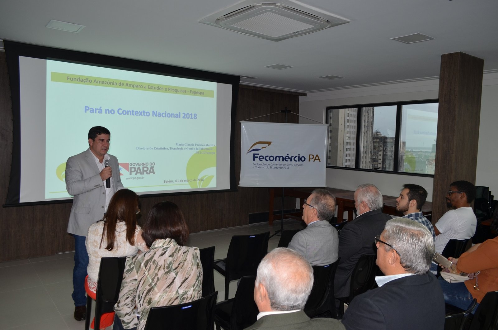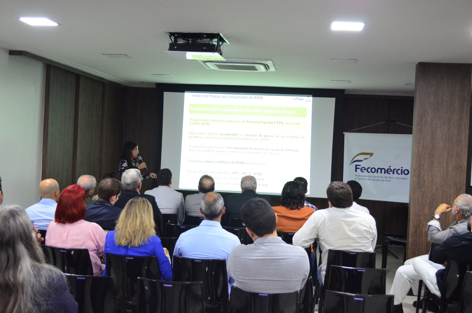 A diretora de Estatísticas, Tecnologia e Gestão da Informação da Fapespa, Maria Glaucia Pacheco Moreira, iniciou apresentando os números do Índice de Preços ao Consumidor da Região Metropolitana de Belém de 2017. Segundo Maria Glaucia, em 2017 foi a primeira vez em toda a série histórica que as categorias alimentos e bebidas apresentaram diminuição de preço. Outro tema abordado foram os indicadores econômicos do comércio, indústria e serviços, apresentados pela Diretora de Estudos Socioeconômicos e Análise Conjuntural da Fapespa, Geovana Raiol Pires. Segundo Geovana Raiol, no ano passado o Pará apresentou retomada no crescimento do saldo do comércio exterior. “A manutenção do crescimento que houve em 2017 também está prevista para o ano de 2018” – afirmou.