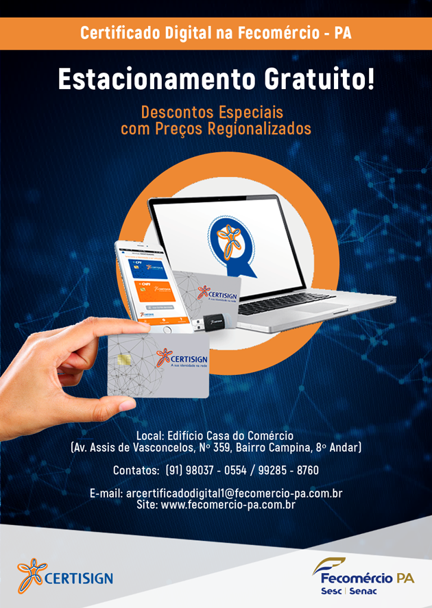 Os Certificados Digitais só podem ser emitidos pelas Autoridades de Registro (AR). A Federação do Comércio de Bens, Serviços e Turismo do Estado do Pará, como Autoridade de Registro, em parceria com a Certisgn, oferece aos empresários do comércio de bens, serviços e turismo, validação presencial em sua própria sede.